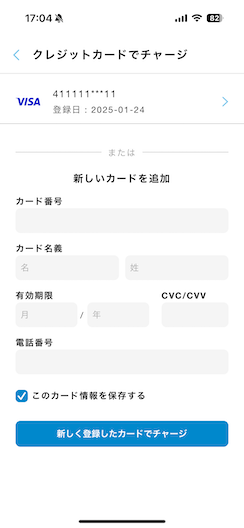 クレジットカードを新規で追加します。すでに追加済の場合は、利用するクレジットカードを選択をします。