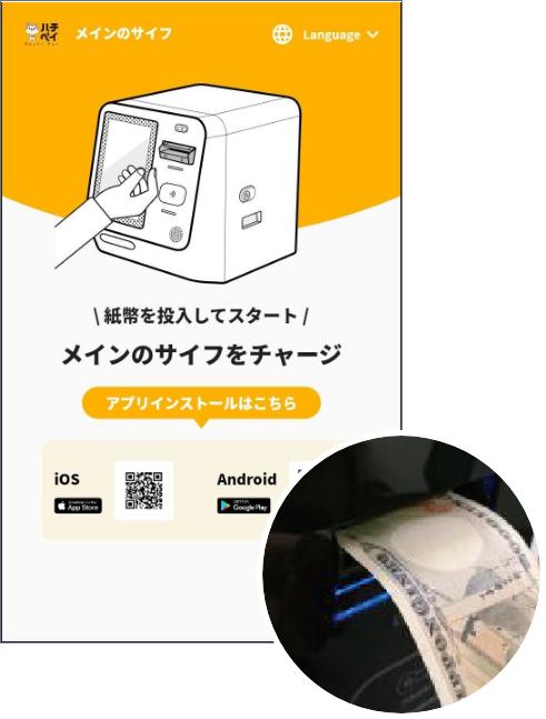 ハチペイ専用チャージ機に、紙幣を入れます。千円/二千円/五千円/一万円 札の4種に対応しています。