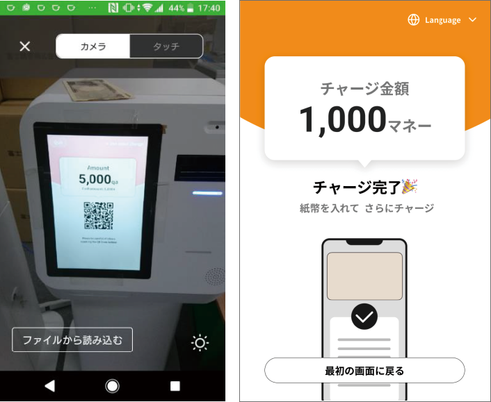 この画面のまま紙幣を入れ、続けてチャージすることも可能です。紙幣を入れると、手順②の画面に遷移します。「最初の画面に戻る」をタップすると、手順①のホームスクリー ンに遷移します。