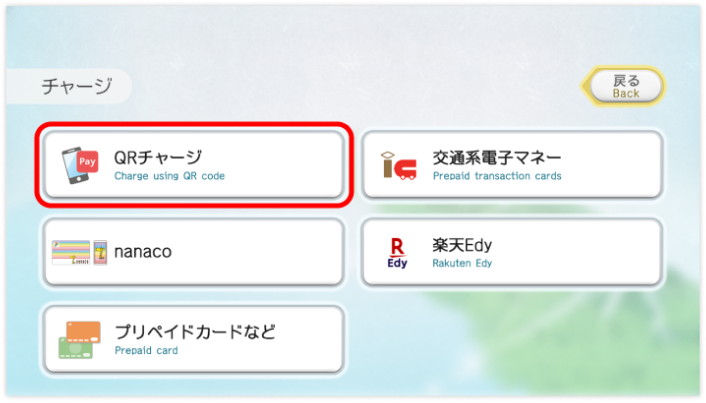 - ②「QRでチャージ」をタップします。ペイスポットにQRコードが表示されます。