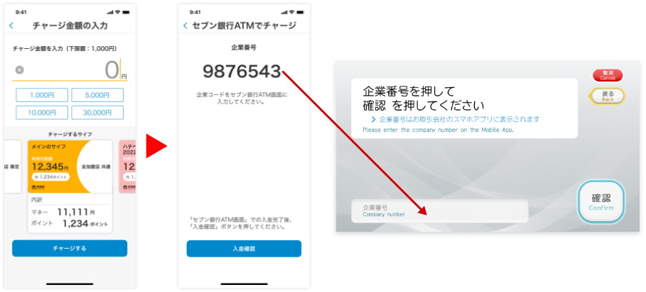 - ④アプリで、チャージしたい金額を入力。表示された「企業番号」をATMに入力。
