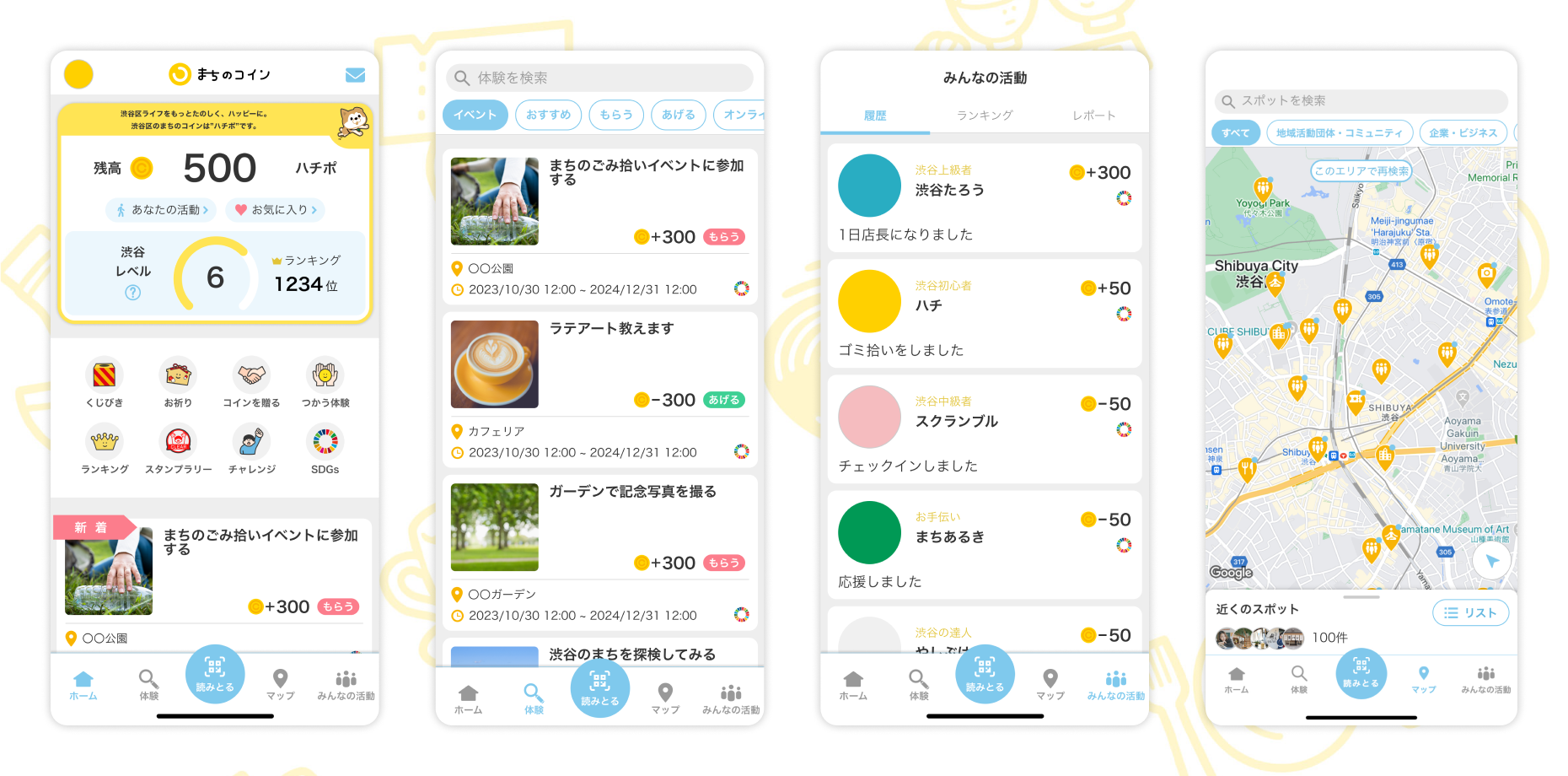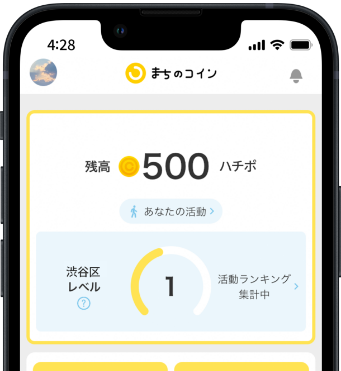 渋谷区のお店・ 団体・人をつなげるアプリで、アプリ名は「まちのコイン」、アプリの中で使うコインの名前は「ハチポ」です。アプリで「ハチポ」をもらったり、あげたりしながら、さまざまな地域の体験に参加することができます。例えば、ちょっとした手伝いごとやまちによいことに参加すると、「ハチポ」がもらえ、もらった「ハチポ」はお店やイベントなどで「お金で買えないようなうれしい体験」をするために使えます。